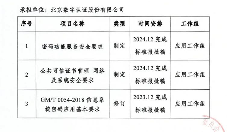 近期,密码行业标准化技术委员会下发了经国家密码管理局批准的2022年密码行业标准制修订计划(商用密码领域),北京数字认证股份有限公司(简称:数字认证)牵头三项密码行业标准获批立项,分别为《密码功能服务安全要求》、《公共可信证书管理  网络及系统安全要求》及《GM/T 0054 信息系统密码应用基本要求》。