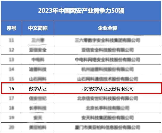 6月21日,中国网络安全产业联盟(简称“CCIA”)发布“2023年中国网安产业竞争力50强”榜单,北京数字认证股份有限公司(简称“数字认证”)再次上榜,这是数字认证连续四年荣登榜单,充分彰显了数字认证在网络安全领域稳扎稳打的产品竞争实力和深受业界认可的品牌综合影响力。