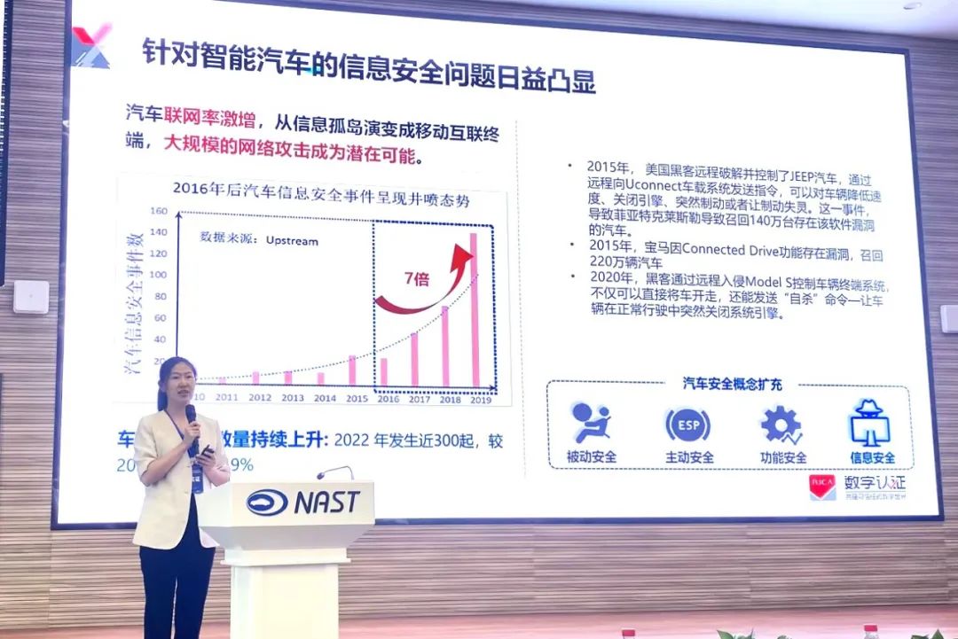 2023年10月19日至20日,“东湖论坛 · 湖北科学技术学术年会 · 2023智能网联汽车网络信息安全论坛”在武汉智能网联汽车测试场召开。本次活动以“智能网联汽车网络信息安全风险及应对”为主题,邀请了中国工程院院士沈昌祥及多位业内知名专家到场,开展政策法规分析、安全防护及测试技术研讨等交流活动。北京数字认证股份有限公司战略业务创新中心总工王琼霄也受邀在现场分享了“智能汽车网络和数据安全防护研究与实现”主题演讲。