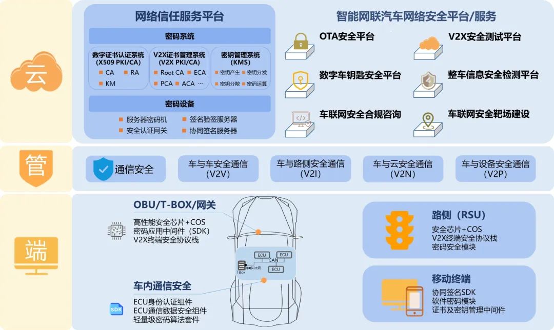 在这个框架中,数字认证通过PKI技术来保障可信任的智能汽车网络构建,利用密码技术应用来提供ECU级别的通信与数据安全能力,并提供安全检测能力助力密码技术实现有效部署与合规应用。例如数字认证的PKI技术可以有效解决车联网中面临的关键安全问题,包括各实体真实性,交互信息来源的真实性、机密性、完整性和不可否认性。