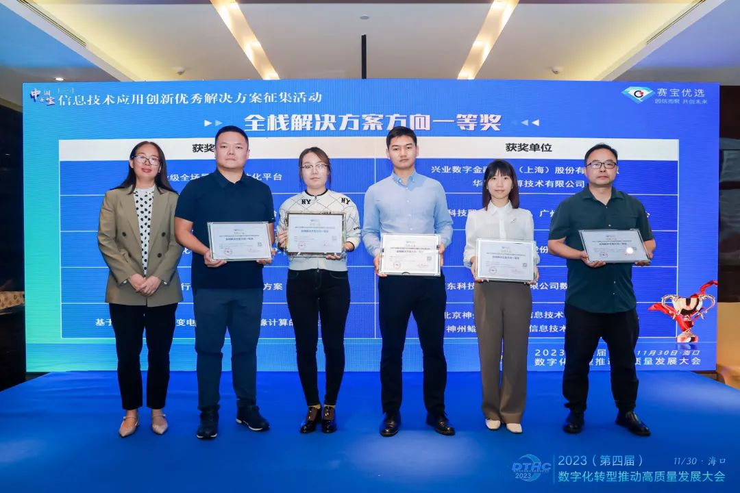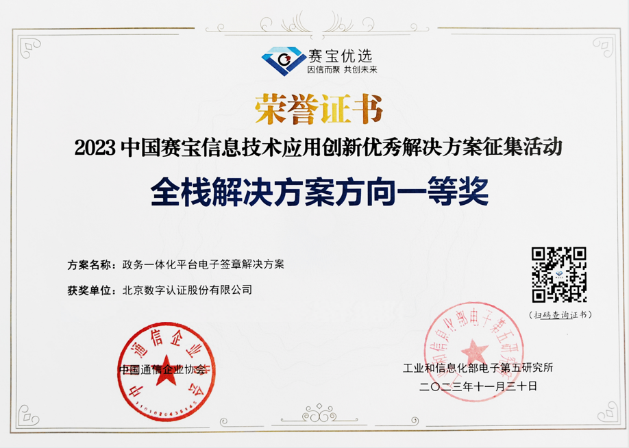 11月30日,在2023(第四届)数字化转型推动高质量发展大会现场,2023中国赛宝信息技术应用创新优秀解决方案征集活动的颁奖仪式隆重举行。北京数字认证股份有限公司报送的“政务一体化平台电子签章解决方案”在决赛的激烈角逐中成功胜出,荣获全栈解决方案方向一等奖。