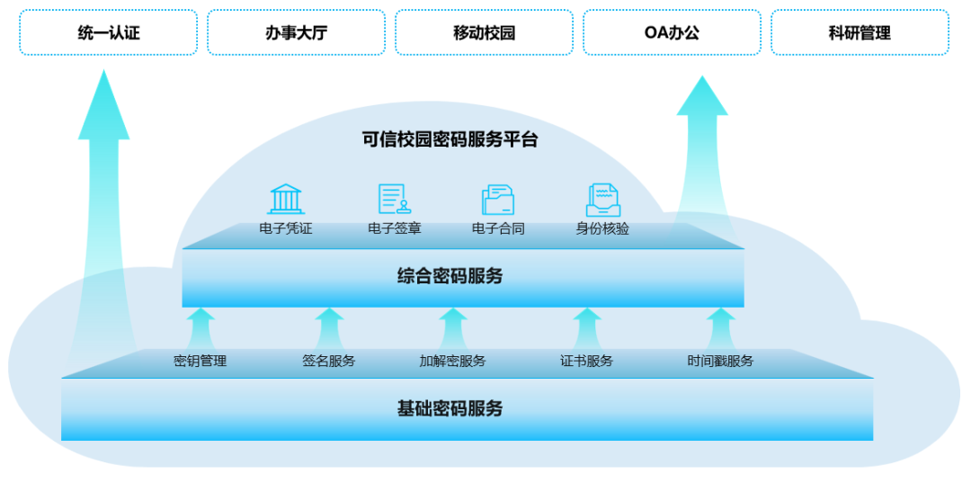 • 适配校园复杂业务系统密码应用需求:依托资源开展集约化建设,以密码技术为支撑、以密码资源服务为基础、密码管理为手段,为教务系统、档案管理系统、电子论文评审等各类业务提供综合密码服务。