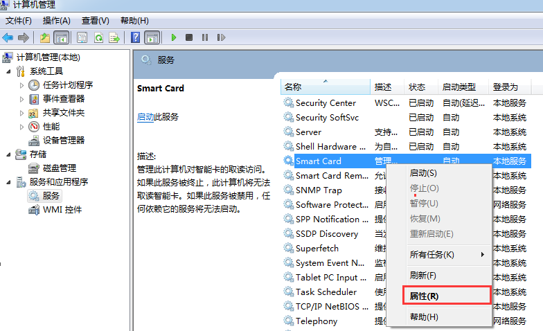2) 打开"Smart Card"服务属性; 点击【服务和应用程序】——点击【服务】——在右侧菜单中找到【Smart Card】——右键点击并选择【属性】,如下图: